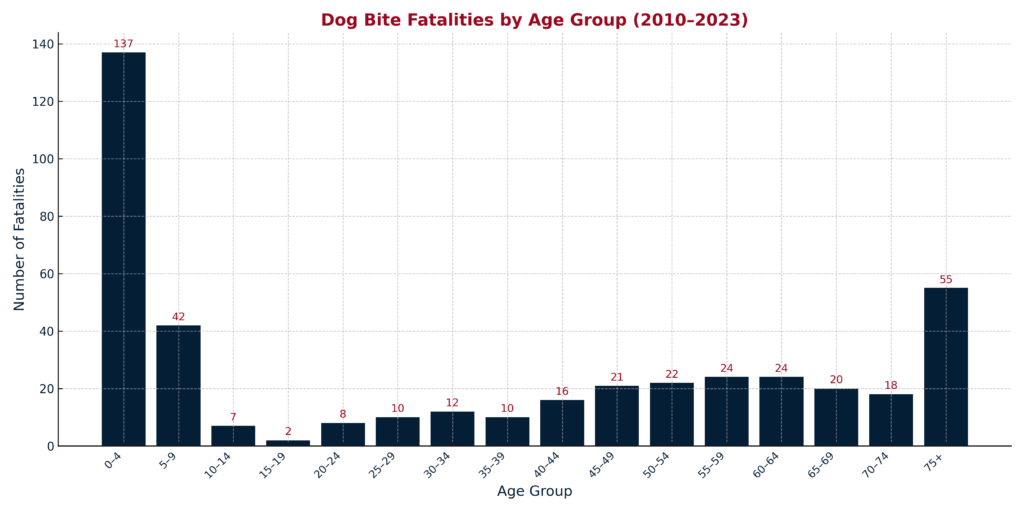 Between 2010 and 2023, the majority of fatal dog bites occurred among children under five and adults over 65.